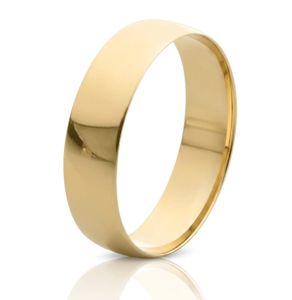Aliança em ouro amarelo 18K, estilo canto quebrado, largura 5mm.