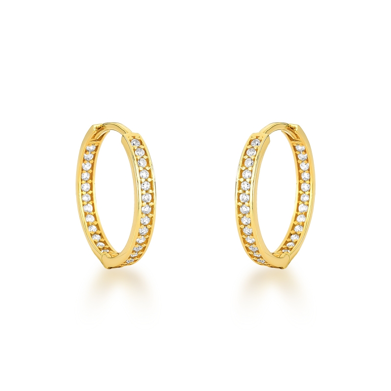 A argola que redefine o conceito de brilho. Este Brinco em Ouro 18k apresenta o sofisticado design de cravação interna e externa, garantindo que as zircônias de 1mm sejam visíveis de qualquer ângulo. O resultado é um efeito "infinito" de luz que ilumina o rosto com elegância máxima.