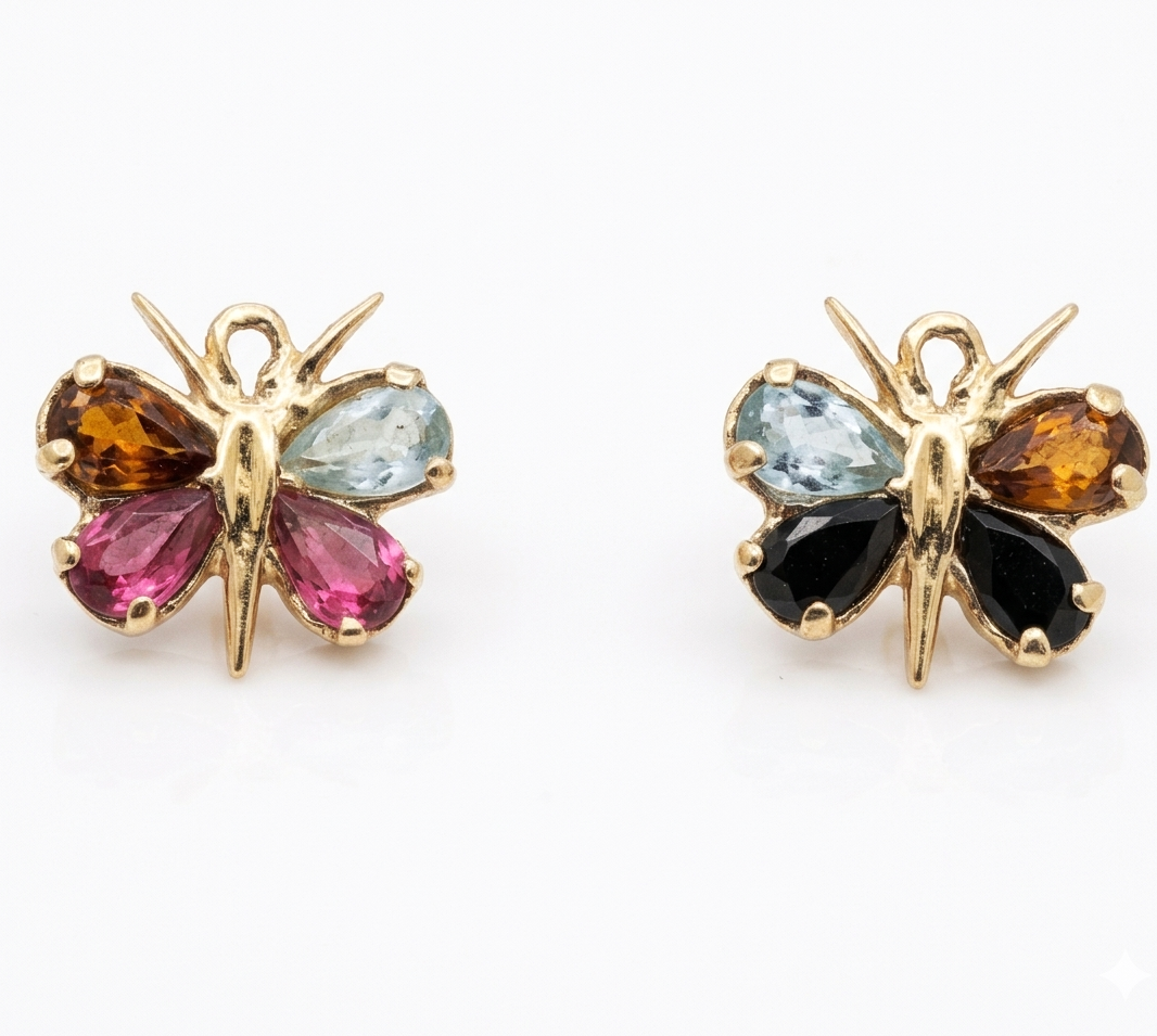 Brinco em ouro 18K borboleta com 4 pedras brasileiras em gotas.