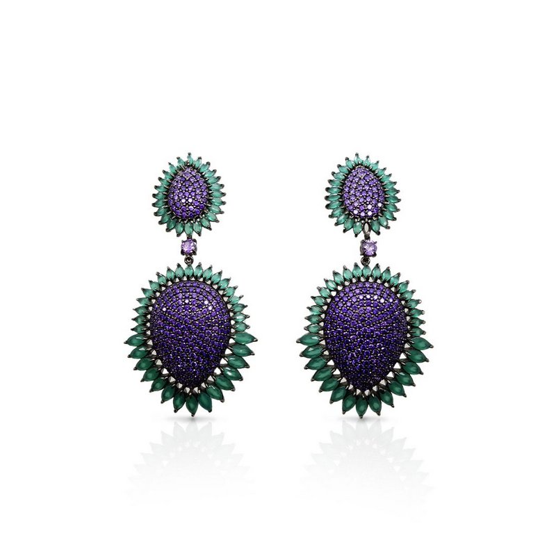 Brinco em prata com banho de ródio negro, centro de pavê de zircônias roxas e borda de navetes verdes.