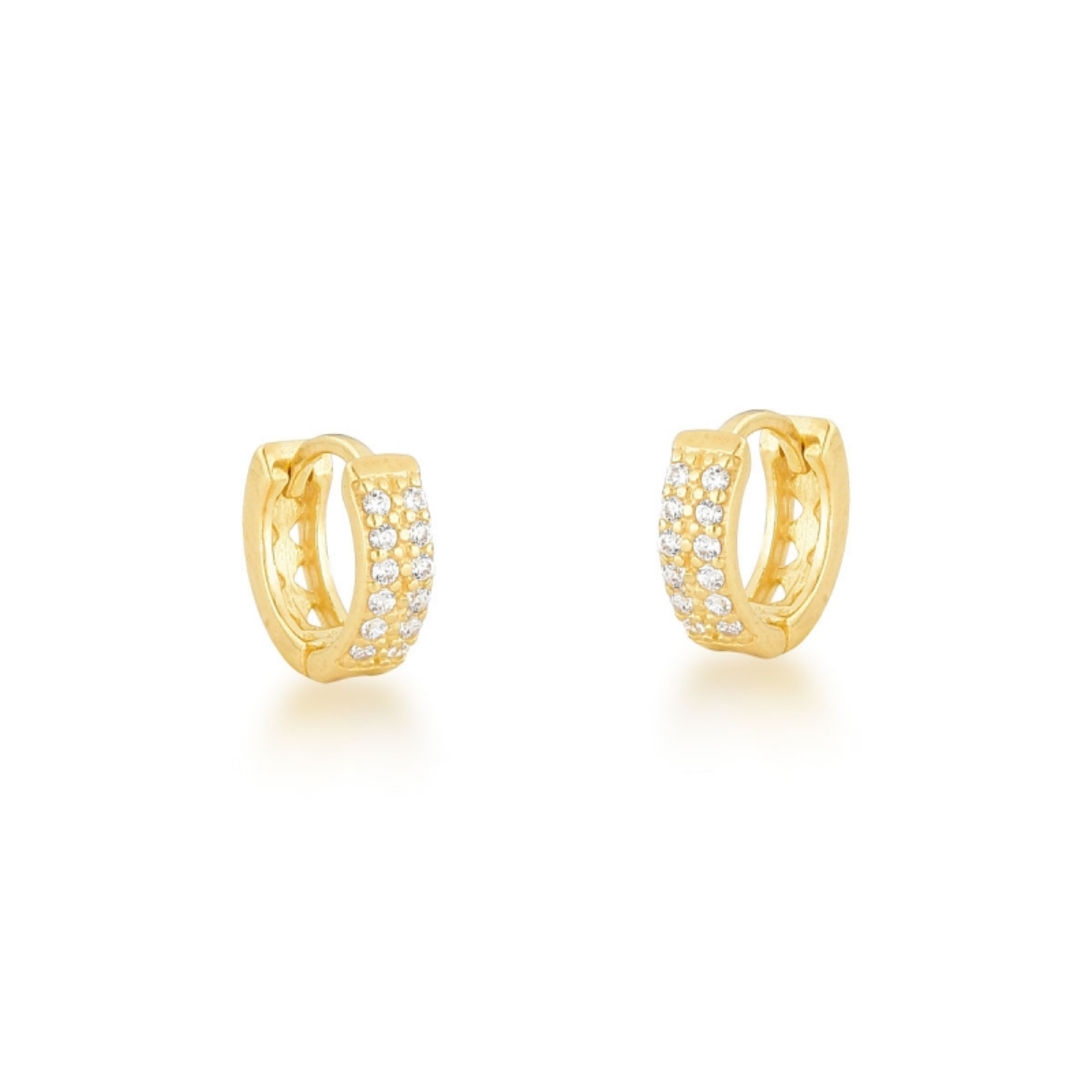 Brinco em ouro 18k, tipo argola, articulado, com 14 zircônias medindo 1mm (cada), cor cristal, dispostas em 02 fileiras na parte frontal.