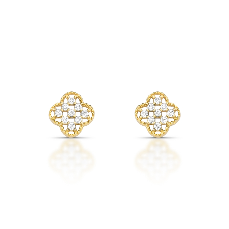 Brinco em ouro 18k, formato de Trevo pequeno com 09 zircônias medindo 1.25mm com cor cristal (cada).