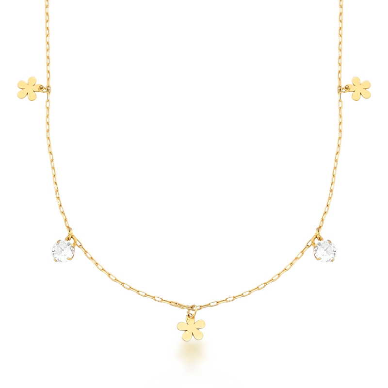 Encante-se com a delicadeza desta Gargantilha tipo Choker em Ouro 18k, uma joia que celebra a feminilidade com um design romântico e iluminado. A peça apresenta uma composição harmoniosa de 04 pontos de luz em zircônia de 4mm, que oferecem um brilho sofisticado, intercalados por 03 flores em ouro maciço, criando um visual leve e primaveril.