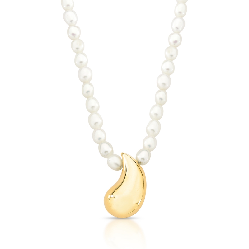 Descubra a delicadeza única desta Gargantilha em Ouro 18k, que combina o charme das Pérolas Biwa (formato arroz) com o design moderno de uma gota curva central. Uma peça que une o clássico das pérolas ao luxo do ouro de forma leve e minimalista.