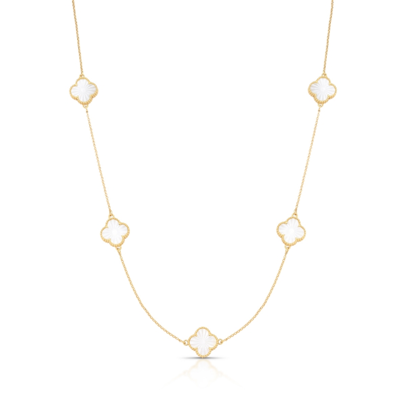 Eleve seu estilo com esta Gargantilha em Ouro 18k, uma joia que exala sofisticação e feminilidade. Com 45cm de comprimento, ela apresenta 05 trevos em Madrepérola natural intercalados, criando um brilho iridescente que ilumina todo o colo.