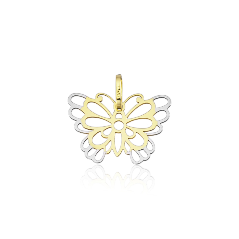 Uma joia que celebra a transformação e a leveza com um toque moderno. Este pingente em formato de borboleta apresenta um design vazado artístico e bicolor, combinando a sofisticação do Ouro Amarelo no centro com o contraste elegante do Ouro Branco nas extremidades das asas. É uma peça delicada, ideal para iluminar o colo com feminilidade.