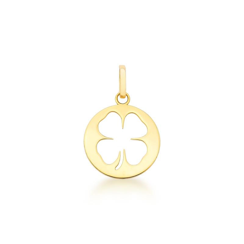 Uma peça que une o simbolismo da sorte a um design leve e contemporâneo. Este Pingente em Ouro 18k apresenta um formato de medalha circular com o trevo de quatro folhas vazado ao centro. A técnica do recorte vazado confere um visual moderno e delicado, permitindo que a pele ou a cor da roupa apareçam através da joia, criando um contraste elegante.