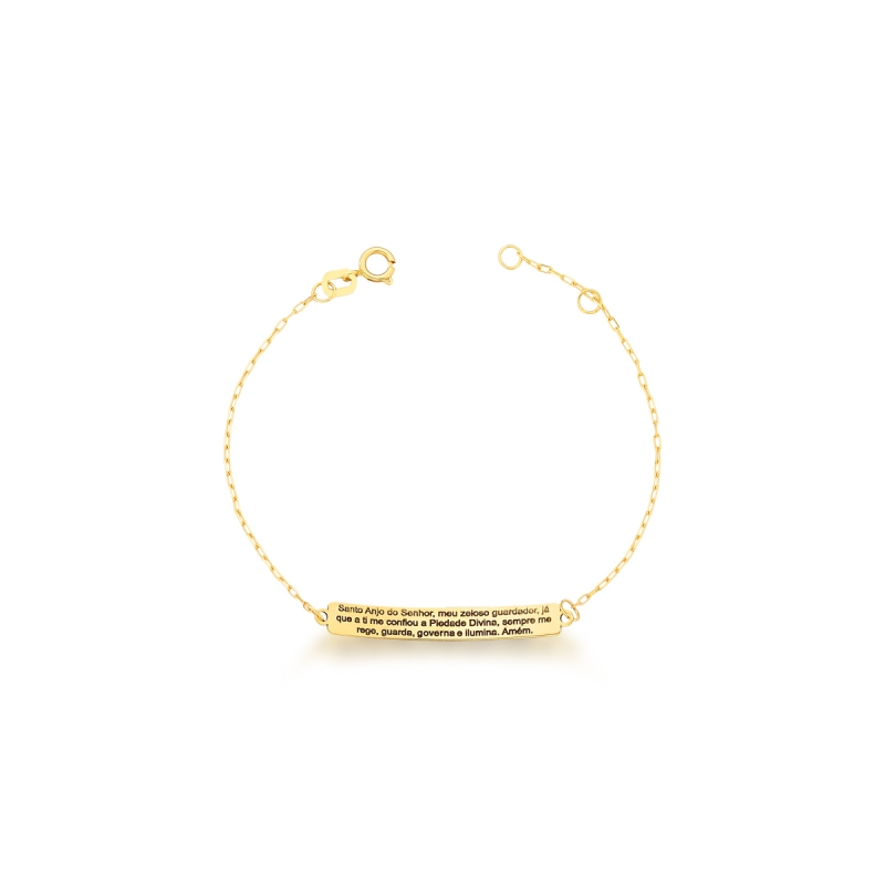 Confeccionada em Ouro 750, a peça possui um acabamento polido espelhado, garantindo que a luz destaque cada palavra da oração gravada. Equipada com um fecho modelo boia e um elo extensor, ela oferece um ajuste confortável e seguro no pulso. É a escolha perfeita para presentear em ocasiões significativas como batizados, primeiras comunhões ou como um símbolo diário de cuidado e devoção.