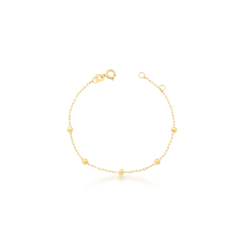 Um clássico da joalheria infantil, esta pulseira de elos finos é adornada com 05 bolinhas de ouro polido distribuídas harmoniosamente. É uma peça leve, atemporal e extremamente confortável para o uso diário dos pequenos.