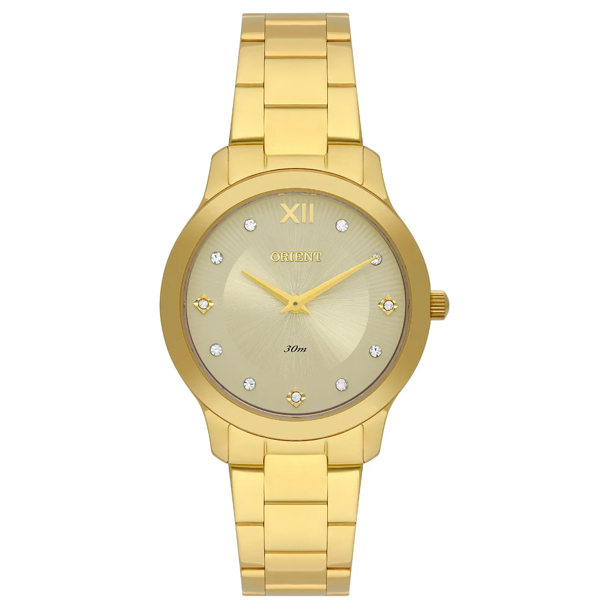 Funções: mostrador sunray com texturas geométricas, ponteiros chanfrados e indexes em relevo e cristais austríacos