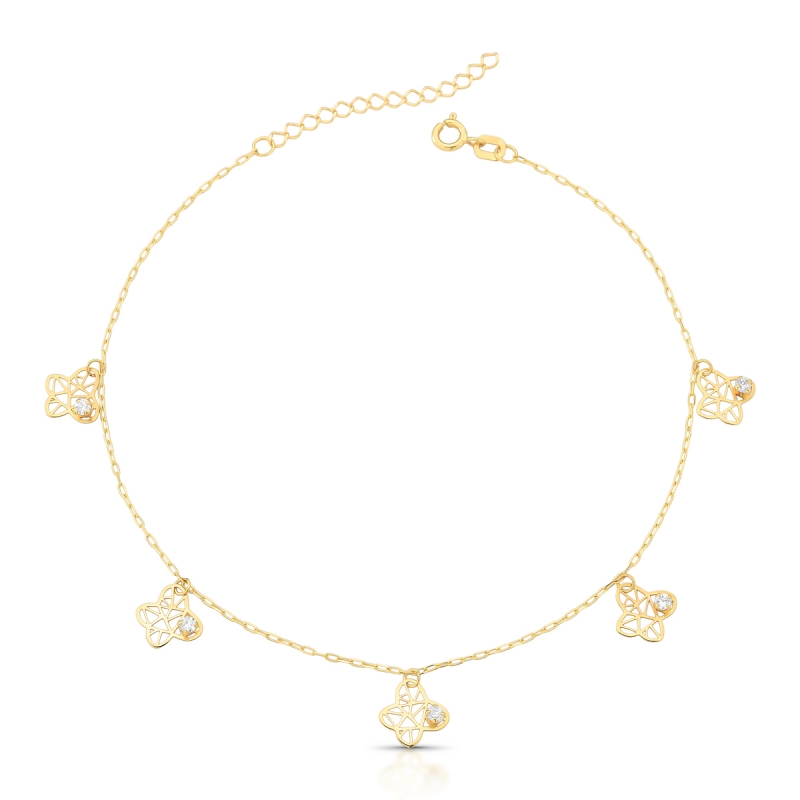 Uma joia que celebra a liberdade e a delicadeza com um design encantador. Esta Tornozeleira em Ouro 18k apresenta uma corrente de elos finos, adornada por cinco pingentes de borboletas vazadas distribuídos de forma graciosa ao longo da peça. O design geométrico e recortado das borboletas confere uma estética moderna e leve, perfeita para realçar o tornozelo com sofisticação.